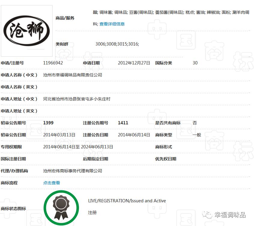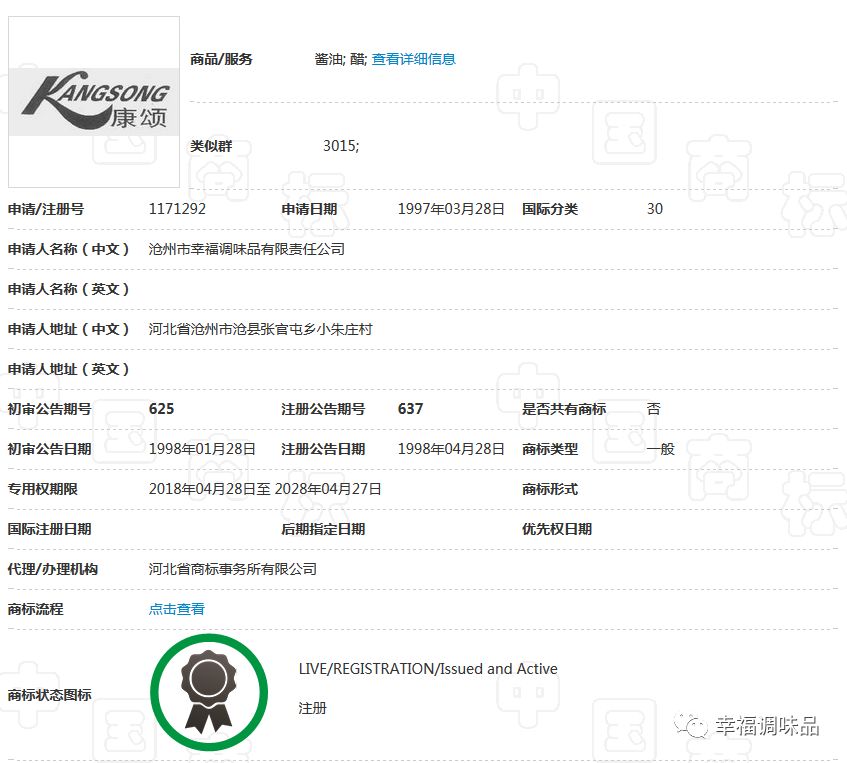 幸福調(diào)味品自創(chuàng)辦30多年以來,在工商部門指導(dǎo)下,充分認(rèn)識到商標(biāo)品牌的重要性,始終堅持走創(chuàng)品牌的路子。公司的“康頌”商標(biāo)于1997年在30類,糖、茶、糕點、調(diào)味品類獲核準(zhǔn)注冊后,并根據(jù)市場需要,先后又注冊了包括“滄獅”中文及拼音在內(nèi)的等商標(biāo);形成了涵蓋多類別、多商品、多層次的商標(biāo)品牌庫。